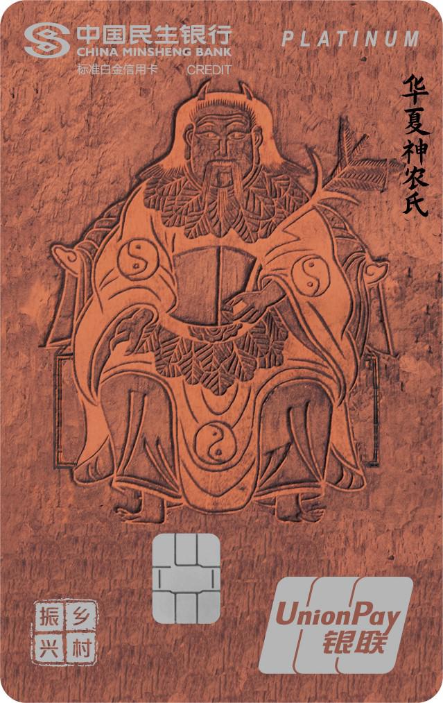 该卡首次采用民生银行定点帮扶县——河南省滑县国家级非遗木版年画为版面,卡面以华夏神农氏为主形象,形象地描绘出农耕文化和民族风情,展现了中华传统美术工艺,为金融机构助力乡村振兴又添硕果。