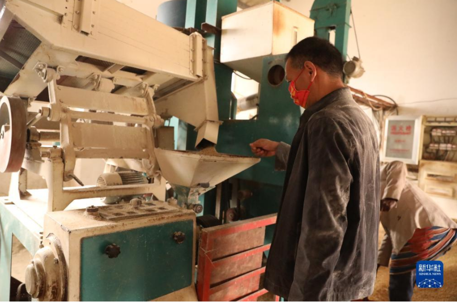 7月25日,在莫桑比克马普托省博阿内地区,中国技术员张浩波在中莫农业技术示范中心加工水稻。
