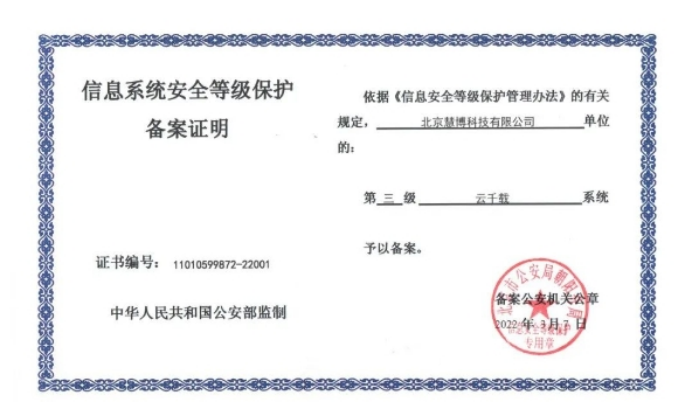 而作为全域消费者数字化运营服务商,我们有责任确保客户用户的隐私得到充分的尊重和保护。慧博科技云千载是行业中同时获得ISO27001(信息安全管理体系认证证书)与「三级等保」双重认证的企业产品,充分体现出慧博科技云千载数据中台系统在用户信息安全管理方面拥有领先的信息技术水平和安全防护能力。