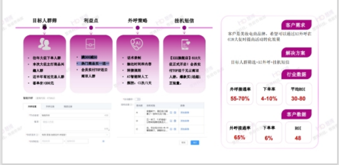 例如,今年618期间,慧博科技某美妆品牌客户,基于慧博慧博云千载数据中台监测到最近上的新品下单的趋势增强,基于该部分兴趣人群的筛选,通过618这个大促契机,以“满300减50 热门商品买一送一”等利益点进行智能AI外呼触达+挂机短信提醒,下单率提升6%。